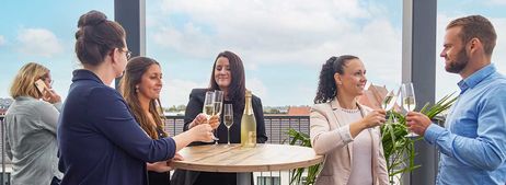 Die Dachterasse lädt zum Netzwerken an der frischen Luft, mit Blick auf das Paulikloster oder die Katharinenkirche ein. In den Pausen kann der Emfpangsraum auch als Bar oder für Buffets genutzt werden. Unseren Service gestalten wir individuell und angepasst an Ihre Veranstaltung.